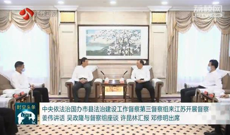 日前,中央全面依法治国委员会办公室市县法治建设工作督察第三督察组组长姜伟率队来江苏开展督察。姜伟出席专题汇报会并讲话。省委书记、省人大常委会主任吴政隆与督察组座谈。省长许昆林作汇报,省委副书记、省委政法委书记邓修明出席会议。