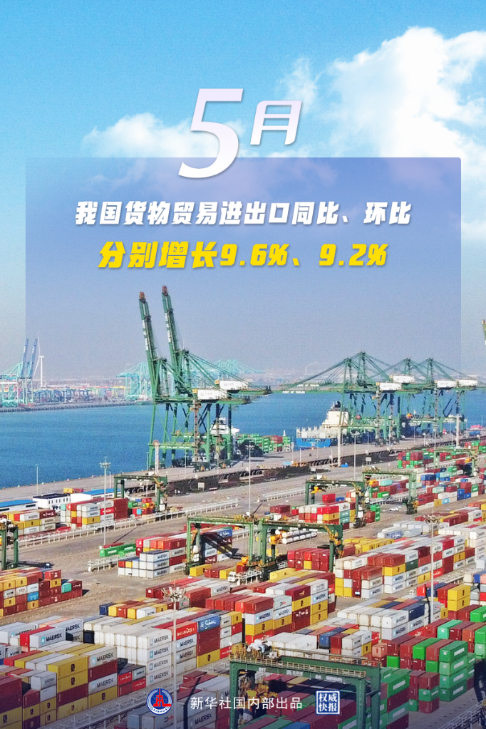 海关总署9日发布数据显示,2022年前5个月,我国货物贸易进出口总值16.04万亿元,同比增长8.3%。其中,5月当月进出口同比、环比分别增长9.6%、9.2%。海关总署统计分析司司长李魁文表示,随着一揽子稳经济政策措施落地见效,外贸物流进一步畅通,企业复工达产进一步提速,我国外贸有望继续保持稳定增长势头。