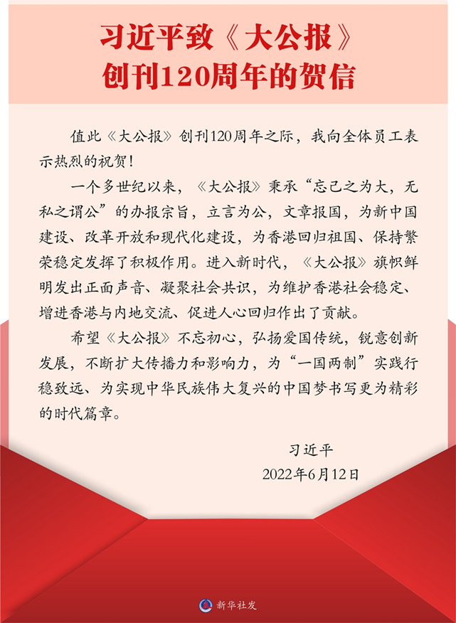 习近平在贺信中指出,一个多世纪以来,《大公报》秉承“忘己之为大,无私之谓公”的办报宗旨,立言为公,文章报国,为新中国建设、改革开放和现代化建设,为香港回归祖国、保持繁荣稳定发挥了积极作用。进入新时代,《大公报》旗帜鲜明发出正面声音、凝聚社会共识,为维护香港社会稳定、增进香港与内地交流、促进人心回归作出了贡献。