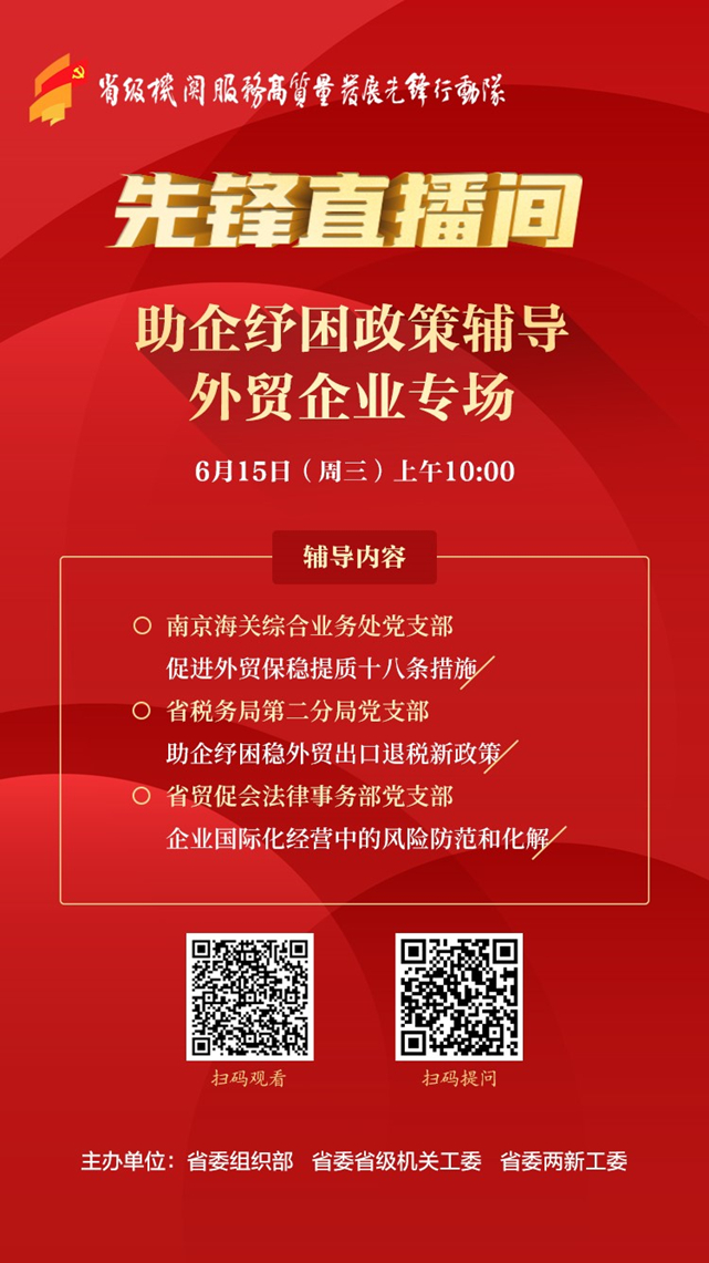 想提高进出境物流效率?想了解出口信用保险赔款视同收汇如何办理出口退税?想知道如何防范、应对持续的疫情冲击和复杂严峻的国际经贸形势,并稳定开拓国际市场?6月15日10时,由省委组织部、省委省级机关工委、省委两新工委共同打造的省级机关服务高质量发展“先锋直播间”助企纾困政策辅导外贸企业专场开播,南京海关、省税务局、省贸促会等部门单位相关先锋队党支部将走进直播间,与广大网友“面对面”传政策,“手把手”教操作。