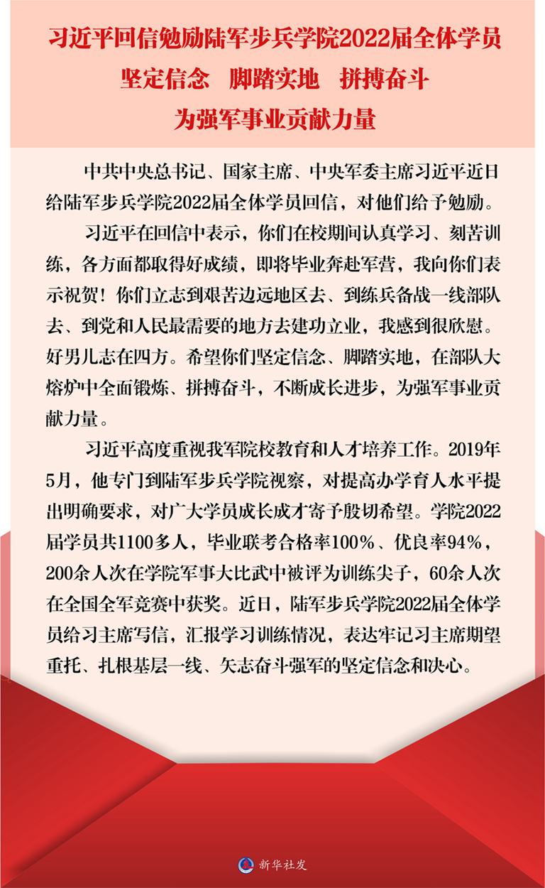 新华社北京6月20日电 中共中央总书记、国家主席、中央军委主席习近平近日给陆军步兵学院2022届全体学员回信,对他们给予勉励。