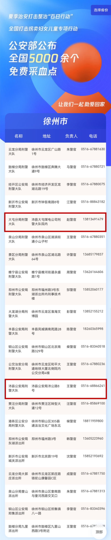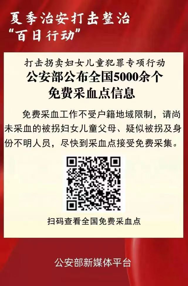 在夏季治安打击整治“百日行动”中,为深入推进打击拐卖妇女儿童犯罪专项行动,充分运用科技力量打拐寻亲,公安部近日公布全国5000余个免费采血点信息,进一步便利广大群众及时就近采血,助力被拐家庭早日实现团圆。