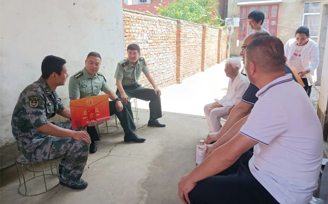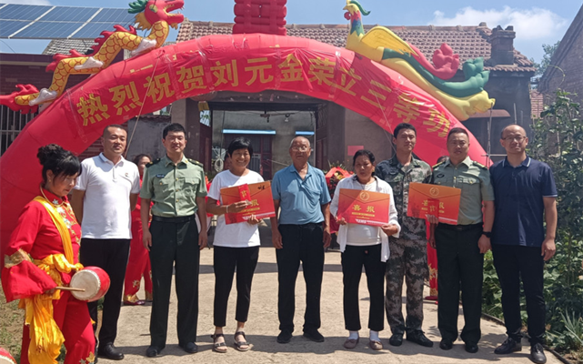 7月7日,胡寨镇人武部相关工作人员为辖区内在部队荣立三等功的现役军人家属送去立功喜报,将党和政府的关心送到家。