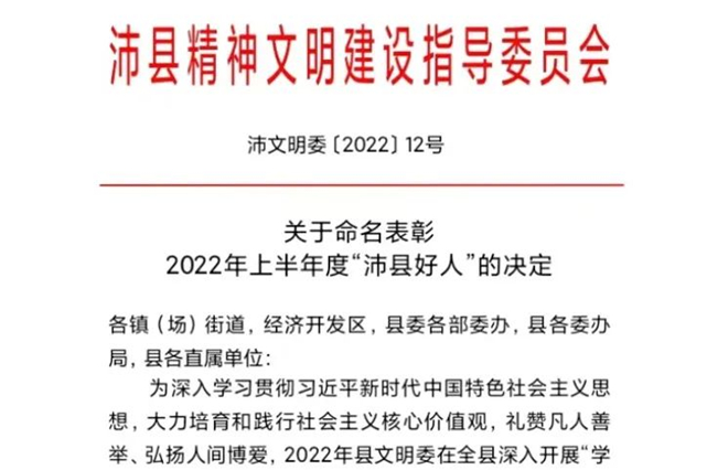 7月7日,沛县精神文明建设指导委员会发布《关于命名表彰2022年上半年度“沛县好人”的决定》,决定对贺和建等10人(组)“沛县好人”予以表彰。