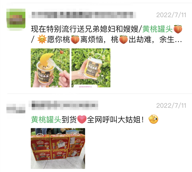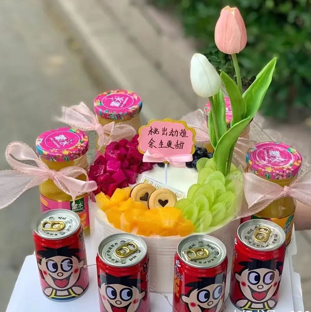 据说,桃的谐音是“逃”,大姑姐给兄弟媳妇买黄桃罐头,寓意逃出劫难,一切顺利。不但如此,还要包上花束、配上蛋糕,寓意逃出劫难,余生更甜。