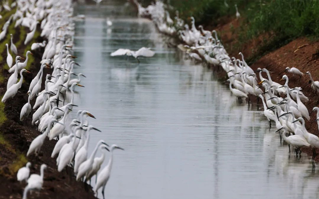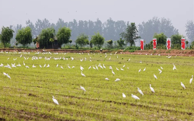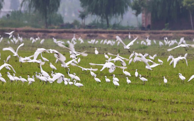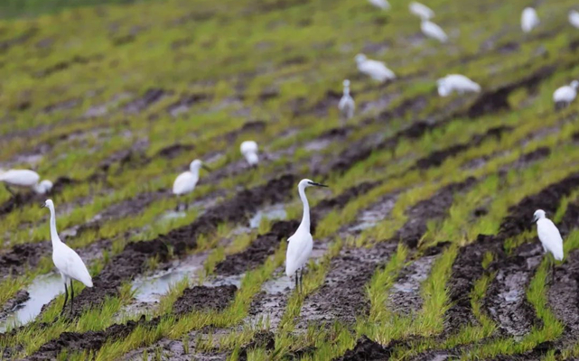 近日,在沛县湖西农场,成群的白鹭悠闲地在田间觅食、嬉戏,形成了一道人与自然和谐共处的美丽画卷!