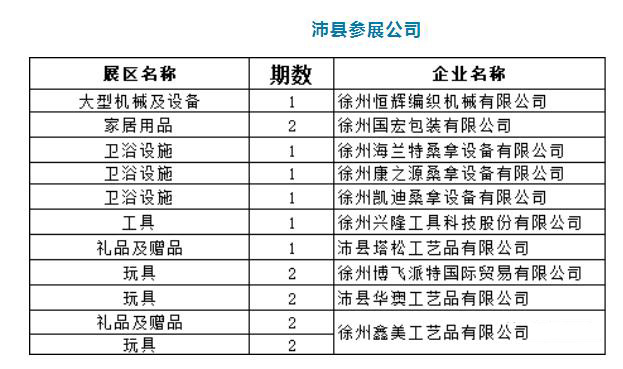 本届广交会,沛县有恒辉编织、国宏包装、海兰特桑拿设备、康之源桑拿设备、凯迪桑拿设备、兴隆工具、塔松工艺品、博飞派特、华澳工艺品、鑫美工艺品等10家企业将在大型机械及设备、家居用品、卫浴设施、工具、礼品及赠品和玩具等展位展示自己的产品。