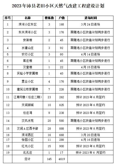 为解决群众“急难愁盼”,沛县住建局带领沛县港华燃气有限公司和设计院深入老小区勘查、排定天然气改建工程实施计划,今年,沛县怡园小区等19个老小区4619户居民将用上管道天然气。目前,怡园小区、滨河东区、滨河西区、农行小区、汉皇楼正在施工中。具体改建工程建设计划如下: