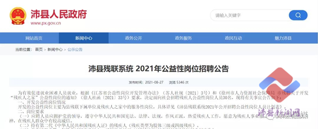 日前,沛县人民政府网发布《沛县残联系统 2021年公益性岗位招聘公告》,决定面向社会招聘残疾人公益性岗位人员30名。具体公告如下: