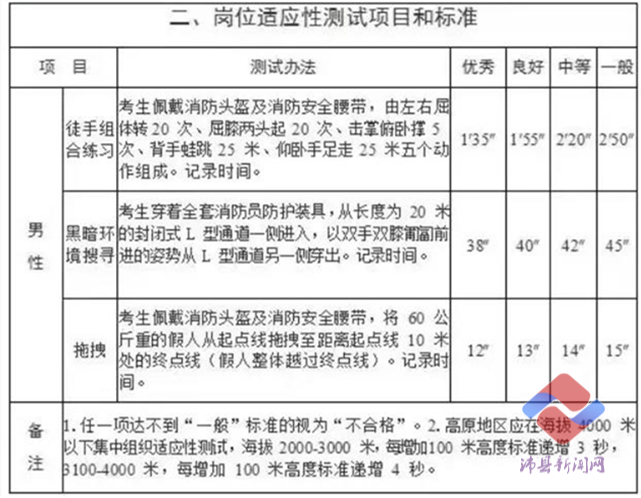(一)政府专职消防队员考核总成绩为100分,60分为合格,择优选拔。考核分为:体能测试、岗位适应性测试和面试三个部分。体能测试参照《政府专职消防队员招录体能测试项目及标准》(附件三),实行量化评分,成绩最高40分;任一单项达不到最低标准的为“不合格”,予以淘汰。岗位适应性测试,实行量化评分,成绩最高30分;主要考核招录对象协调能力,空间位置感知以及对高空、黑暗环境的心理适应度(附件四);面试参考事业单位公开招聘人员做法实施,实行量化评分,成绩最高30分。