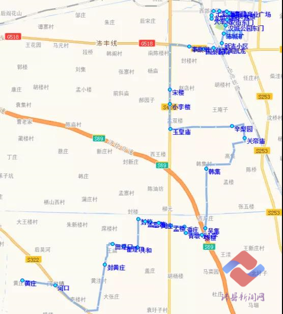 黄庄—河口—封黄庄—田堤口—崔堤口—共和—封楼—孟三楼—高场—周庄—孟楼—潘庄—青墩寺小学—张楼—吴集—韩集—关帝庙—辛梨园—玉皇庙—小李楼—宋楼—事故组—国泰医院—红星美凯龙—五洲新天地南门—教堂—如意家苑—党校—龙飞地雕塑场站。