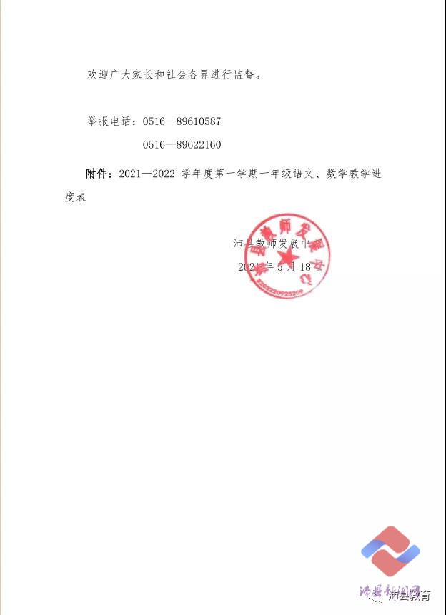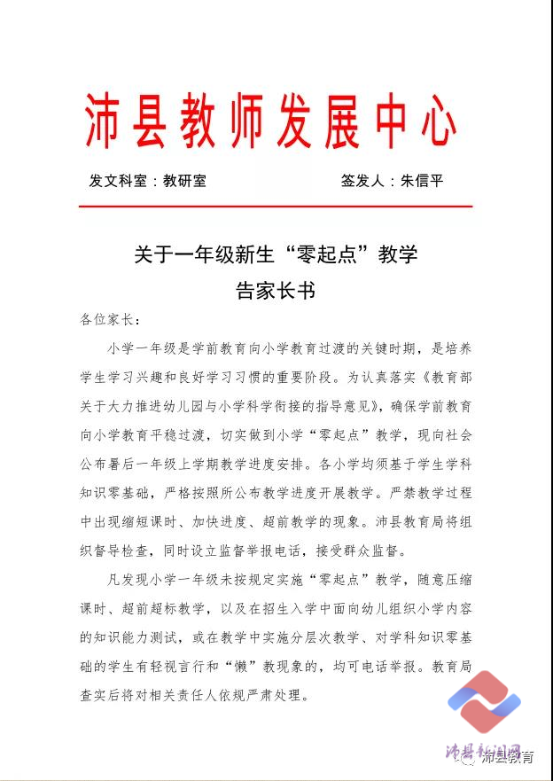 告家长书中表示,各小学均须基于学生学科知识零基础,严格按照所公布教学进度开展教学。严禁教学过程中出现缩短课时、加快进度、超前教学的现象。沛县教育局将组织督导检查,同时设立监督举报电话,接受群众监督。凡发现小学一年级未按规定实施“零起点”教学,随意压缩课时、超前超标教学,以及在招生入学中面向幼儿组织小学内容的知识能力测试,或在教学中实施分层次教学、对学科知识零基础的学生有轻视言行和“懒”教现象的,均可电话举报。教育局查实后将对相关责任人依规严肃处理。欢迎广大家长和社会各界进行监督。举报电话:0516-89610587 0516-89622160。