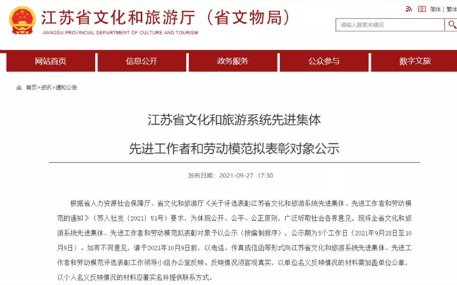 日前,江苏省文化和旅游厅发布《江苏省文化和旅游系统先进集体先进工作者拟表彰对象公示》。