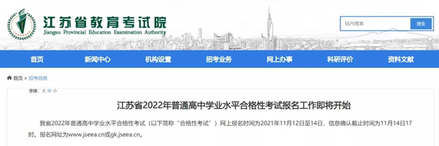 江苏省2022年普通高中学业水平合格性考试(以下简称“合格性考试”)网上报名时间为2021年11月12日至14日,信息确认截止时间为11月14日17时。报名网址为www.jseea.cn或gk.jseea.cn。
