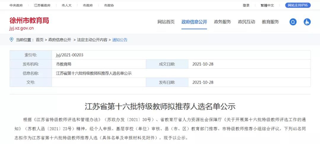 28日,徐州市教育局发布江苏省第十六批特级教师拟推荐人选名单公示,此次拟推荐人选45名,公示时间:2021年10月28日-11月3日。