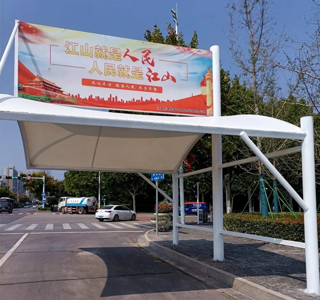 这些遮阳挡雨棚为钢架结构,顶部封闭,四周通透,不会影响行人视野,除了发挥遮阳挡雨功能之外,遮阳挡雨棚还成为新的公益宣传阵地。不少遮阳挡雨棚上设置了公益广告位,并结合我县创建全国文明城市工作,弘扬倡导文明新风,普及文明常识,既让市民接受文明教育,又为文明城市创建增光添彩。