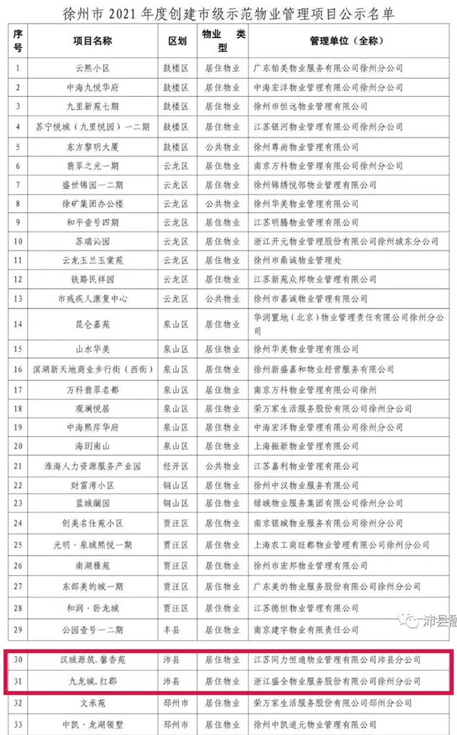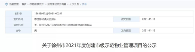 近日,徐州市住房和城乡建设局发布《关于徐州市2021年度创建市级示范物业管理项目的公示》。