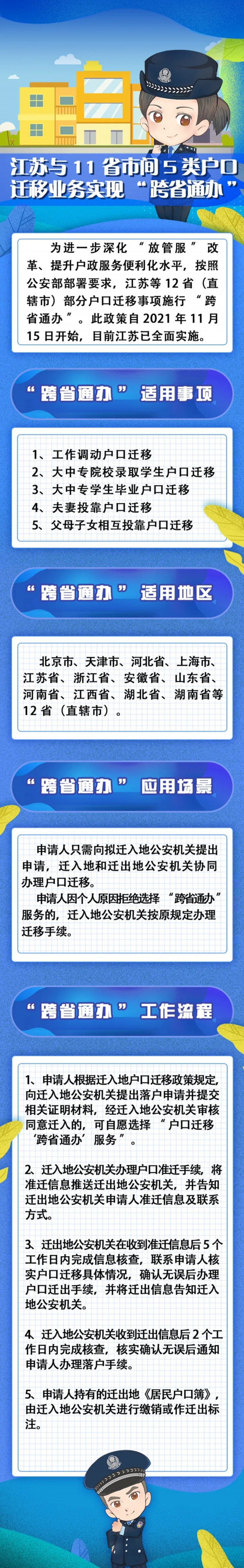 为进一步深化“放管服”改革、提升户政服务便利化水平,按照公安部部署要求,江苏等12省(直辖市)部分户口迁移事项施行“跨省通办”。此政策自2021年11月15日开始,目前江苏已全面实施。