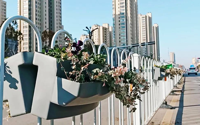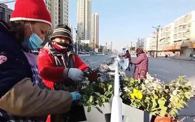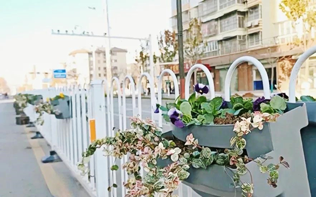 在新沛路上,道路中间园林工人正在紧张地忙碌着,在栏杆上挂上花盆,倒入营养土,把从苗圃里培育好的各色角堇和花叶络石栽种进去。