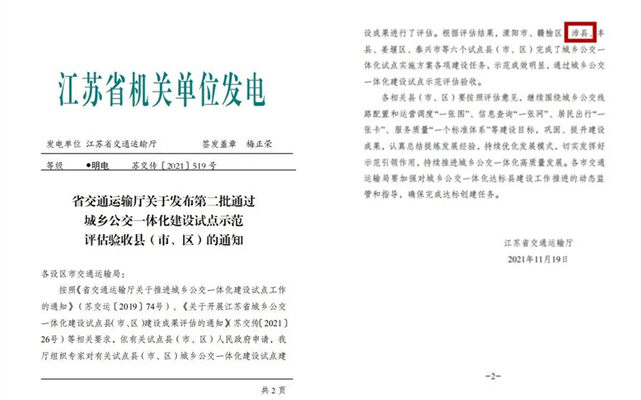 日前,省交通运输厅发布第二批通过评估验收的城乡公交一体化建设试点示范县(市、区)名单,沛县成功入选。