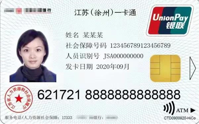 在外观方面,江苏(徐州)一卡通的国徽面印有“中华人民共和国社会保障卡”字样;