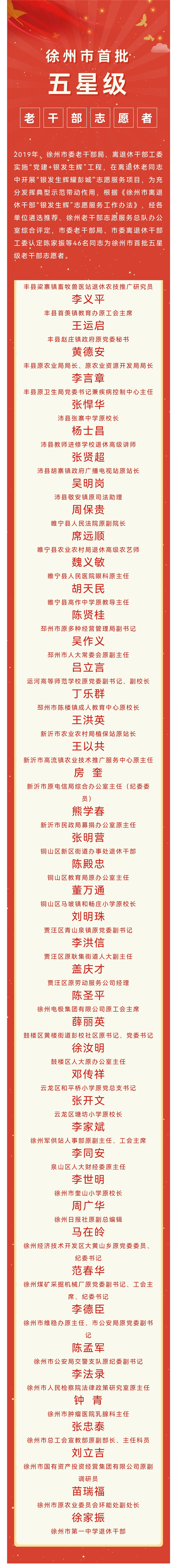 2019年,徐州市委老干部局、离退休干部工委实施“党建+银发生辉”工程,在离退休老同志中开展“银发生辉耀彭城”志愿服务项目,为充分发挥典型示范带动作用,根据《徐州市离退休干部“银发生辉”志愿服务工作办法》,经各单位遴选推荐、徐州老干部志愿服务总队办公室综合评定,市委老干部局、市委离退休干部工委认定陈家振等46名同志为徐州市首批五星级老干部志愿者。其中,沛县张悍华、杨士昌、张贤超、吴明岗4人上榜!
