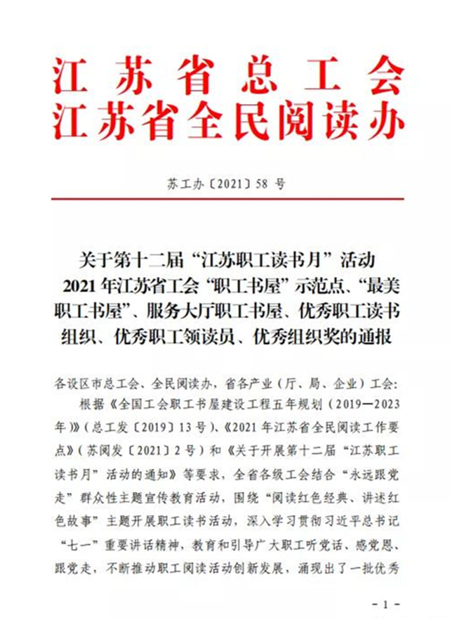此外,近日,江苏省总工会、江苏省全民阅读办联合发布《关于第十二届“江苏职工读书月”活动2021 年江苏省工会“职工书屋”示范点、“最美职工书屋”、服务大厅职工书屋、优秀职工读书组织、优秀职工领读员、优秀组织奖的通报》。