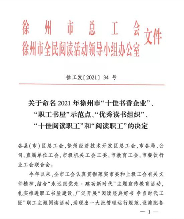 近日,市总工会下发《关于命名2021年徐州市“十佳书香企业”、“职工书屋”示范点、“优秀读书组织”“十佳阅读职工”和“阅读职工”的决定》,对管理运行规范、设施配备齐全、作用发挥良好的职工书屋和崇尚学习钻研、坚持勤奋阅读、自我提升成才的优秀职工进行认定。