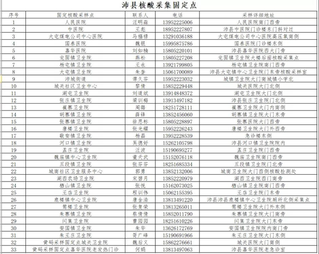 沛县公布全县33个核酸采集固定点,请市民根据需求就近选择。