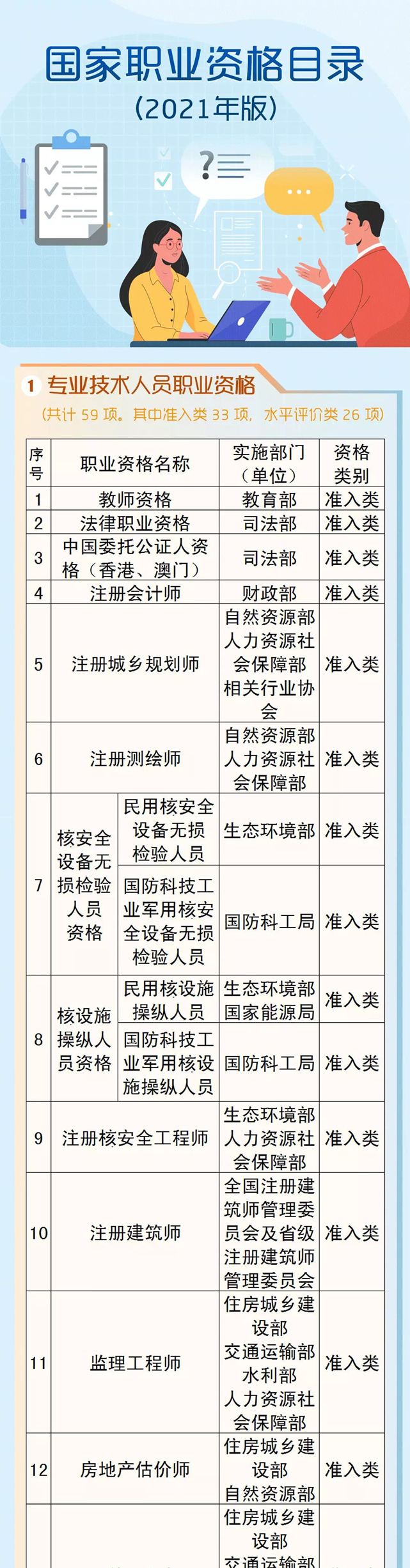在专业技术人员职业资格方面,新增“精算师”“矿业权评估师”水平评价类职业资格,在医生资格下设置“职业病诊断医师”子项。新增职业资格项目均具有较强的专业性和社会通用性,技术技能要求较高,行业管理和人才队伍建设确实需要。