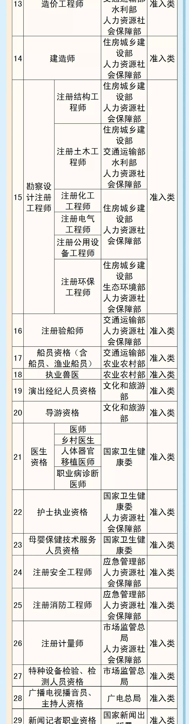 在专业技术人员职业资格方面,“出入境检疫处理人员资格”、“乡村兽医资格”和勘察设计注册工程师下的“注册石油天然气工程师”“注册冶金工程师”“注册采矿/矿物工程师”“注册机械工程师”退出目录,从业人员依据行业标准开展技术活动。