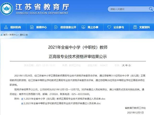 近日,江苏省教育厅公示了2021年全省中小学(中职校)教师正高级专业技术资格评审结果。