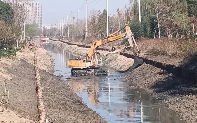 在正阳大沟项目区,挖掘机全速作业,清理淤泥、平整岸基。该项目区计划投资1000万元,对河道进行清淤,安插木桩,种植水生植物等,目前已接近尾声。