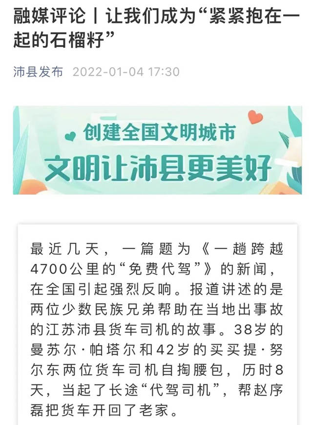 1月4日,沛县发布又继续发布连续报道:《库尔勒收到沛县的感谢信啦!》,以及融媒评论:《让我们成为“紧紧抱在一起的石榴籽”》。