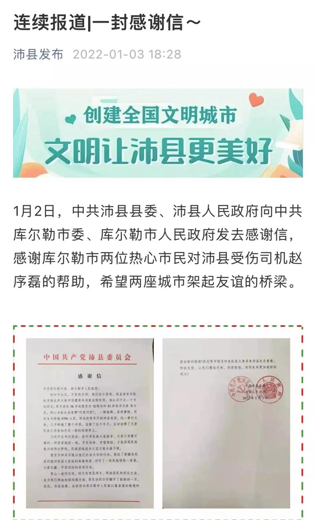 1月3日,沛县发布发表连续报道:《一封感谢信》。