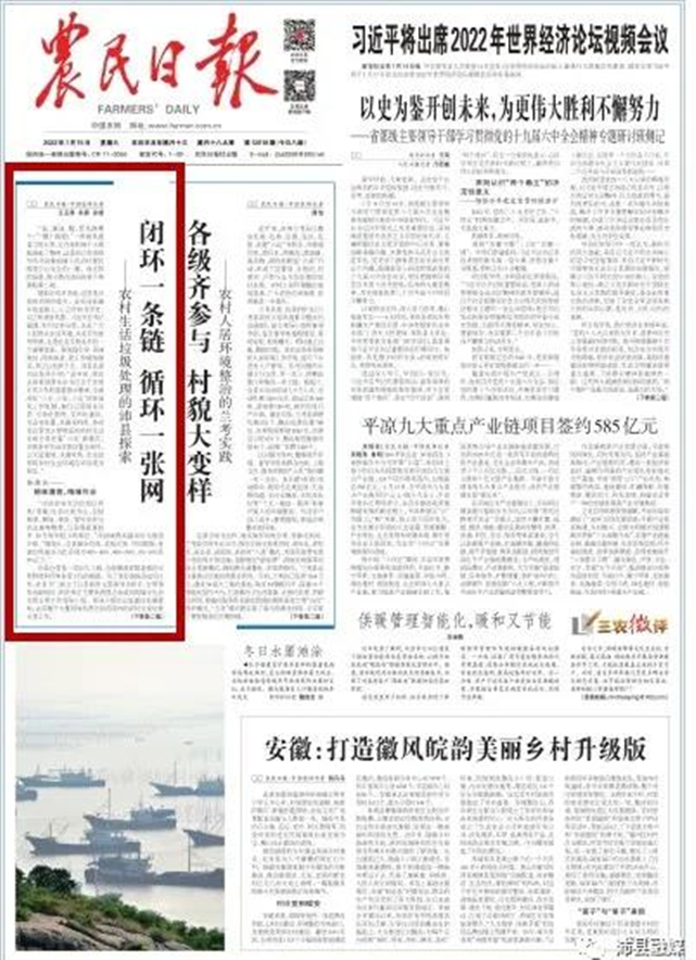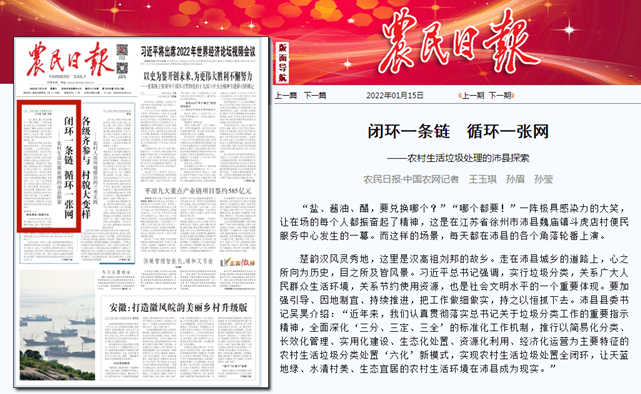 近日,《农民日报》头版头条刊登了一则新闻——《闭环一条链 循环一张网——农村生活垃圾处理的沛县探索》,内文介绍了沛县农村生活垃圾处理的众多亮点及建设成效。