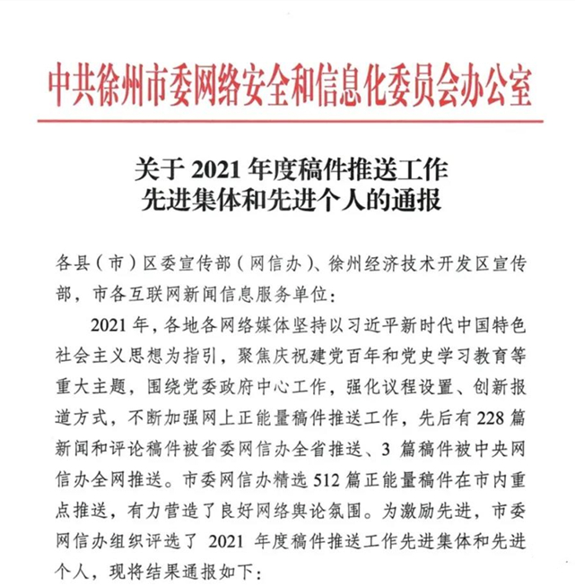 1月17日,徐州市委网信办公布了2021年度稿件推送工作先进集体和先进个人。沛县融媒体中心被表彰为全市稿件推送工作先进集体。