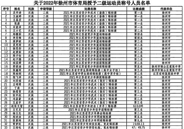 1月19日,徐州市体育局发布关于2022年徐州市体育局授予冯嘉豪等68名二级运动员称号的通知。