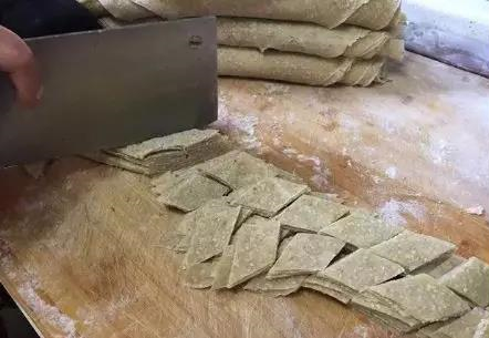 将刚刚炕好的面皮切成菱形小块。