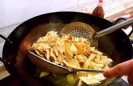 将菱形状面皮下锅油炸,炸至金黄色时,捞出沥油,即可食用。