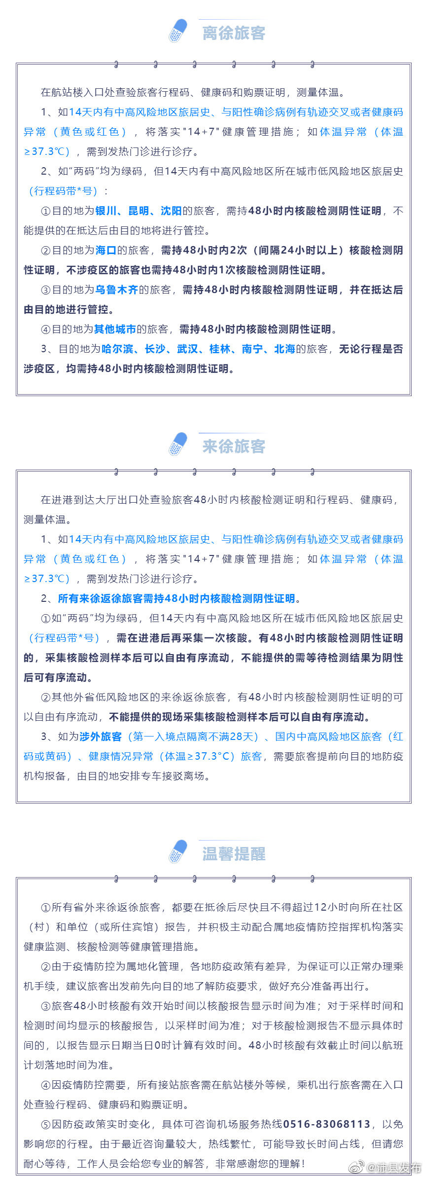 “徐州观音国际机场”发布徐州机场最新防疫政策: