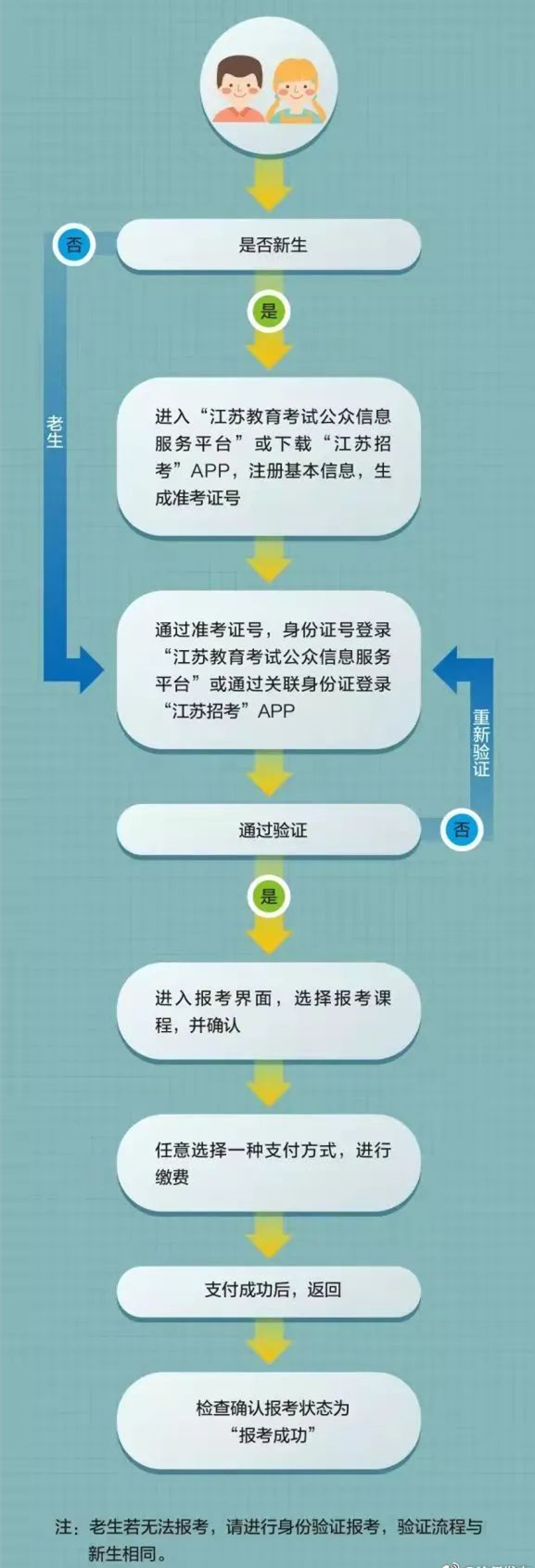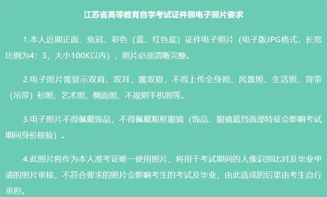 ②每名考生每天只能进行三次身份验证,三次验证均未能通过者,可第二天继续进行网上身份验证及报考。身份验证上传的证件照作为考生存档照片,将用于准考证打印和其他业务办理,须符合江苏省高等教育自学考试证件照电子照片要求,照片不达要求导致的后果由考生自行承担。如有疑问,请咨询:83700492。