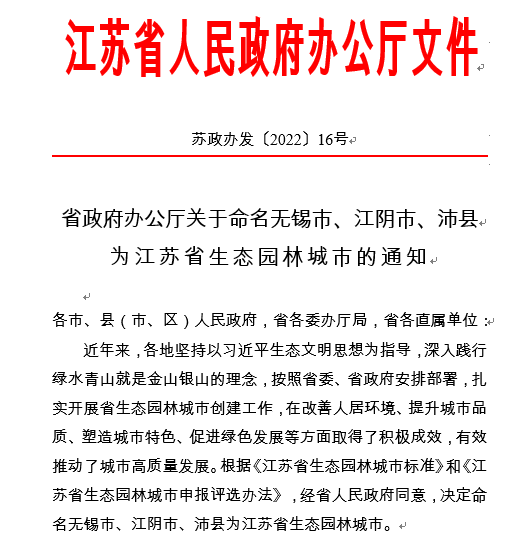 近日,江苏省政府办公厅正式下发通知,决定命名沛县为“江苏省生态园林城市”。