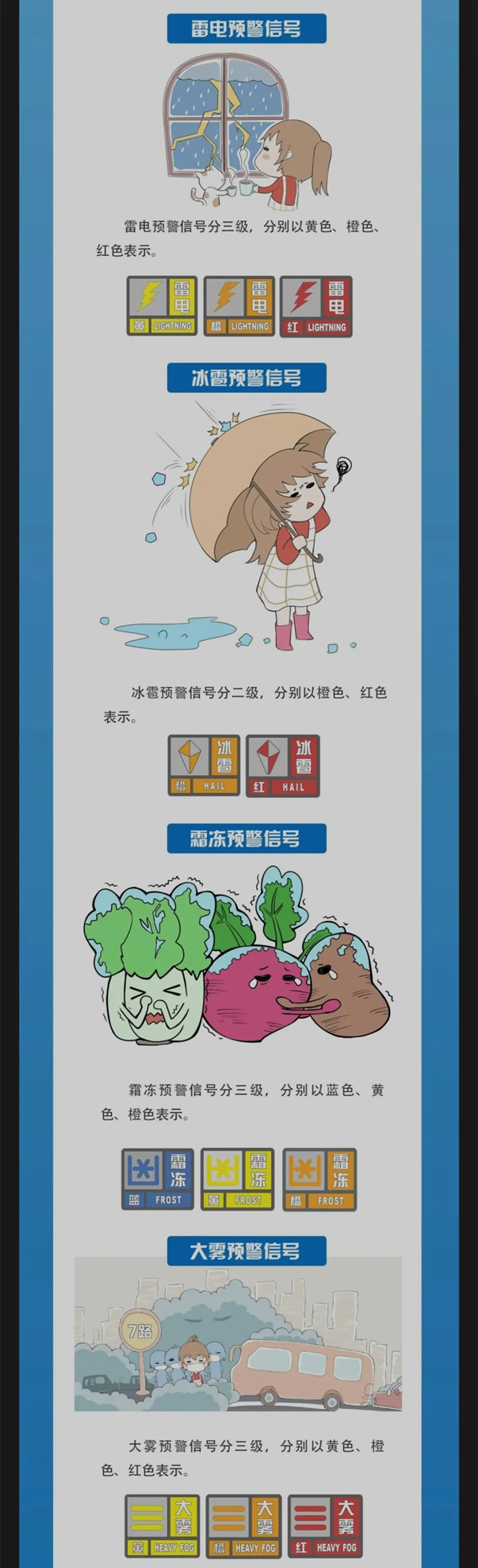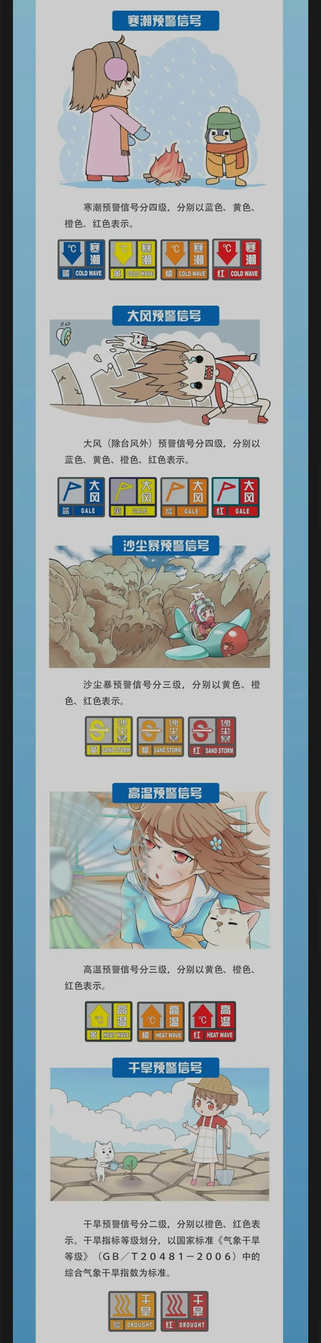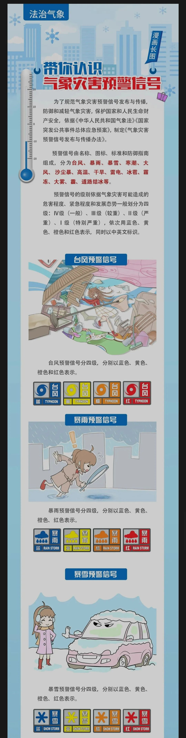 中国是世界上受气象灾害影响最严重的国家之一,气象灾害所造成的损失占自然灾害损失的70%以上。而气象灾害预警信号是有关部门和社会公众防御气象灾害的重要依据之一。那么气象灾害预警信号有哪些?预警分为几个等级?这张长图带您认识气象灾害预警信号!