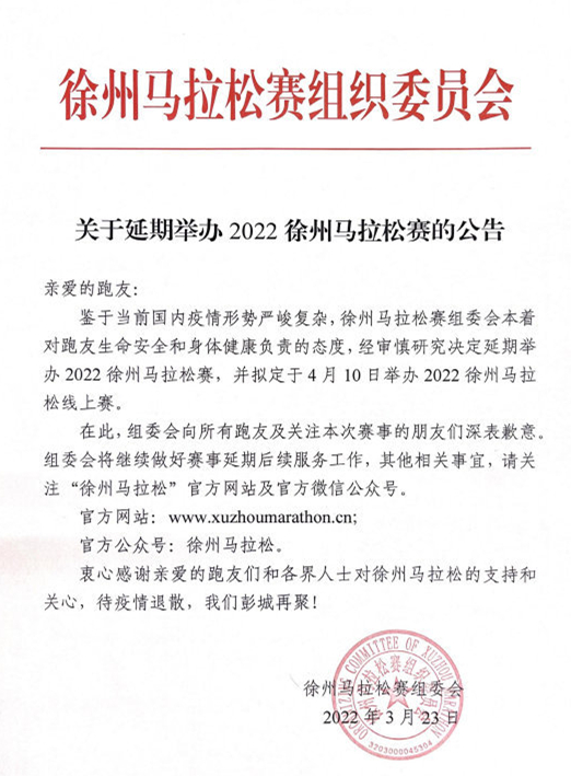 徐州马拉松赛组织委员会今天发布《关于延期举办2022徐州马拉松赛的公告》,经审慎研究决定延期举办2022徐州马拉松赛,并拟定于4月10日举办2022徐州马拉松线上赛。其他相关事宜,请关注“徐州马拉松”官方网站及官方微信公众号。