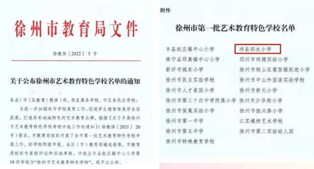3月22日,徐州市教育局公布了“第一批徐州市艺术教育特色学校”名单,沛县泗水小学榜上有名,这也是沛县唯一获批的“第一批徐州市艺术教育特色学校”。