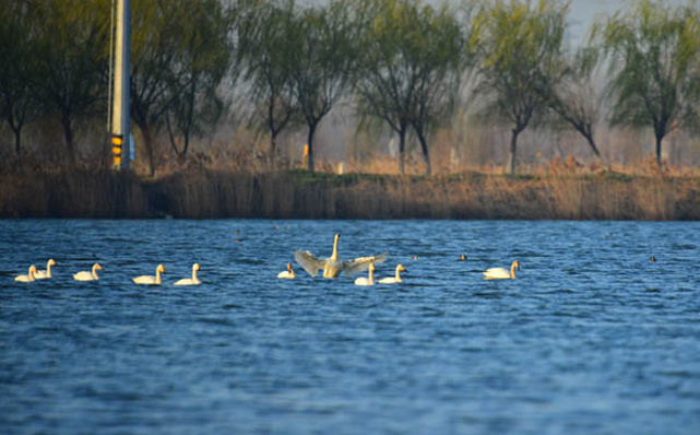 碧波荡漾,水天一色,在一望无垠的湖荡中,成群的候鸟在泛黄的芦苇间自在嬉戏,候鸟翻飞,声震四野,使得冬天的安国湖湿地美不胜收,这里成为了候鸟越冬的“天堂”。