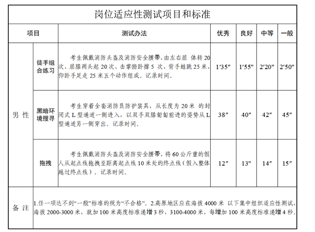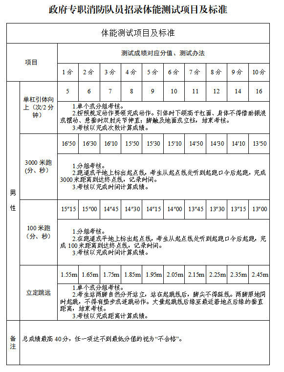 (一)政府专职消防队员考核总成绩为100分,60分为合格,择优选拔。考核分为:体能测试、岗位适应性测试和面试三个部分。体能测试参照《政府专职消防队员招录体能测试项目及标准》(附件三),实行量化评分,成绩最高40分;任一单项达不到最低标准的为“不合格”,予以淘汰。岗位适应性测试,实行量化评分,成绩最高30分;主要考核招录对象协调能力,空间位置感知以及对高空、黑暗环境的心理适应度(附件四);面试参考事业单位公开招聘人员做法实施,实行量化评分,成绩最高30分。