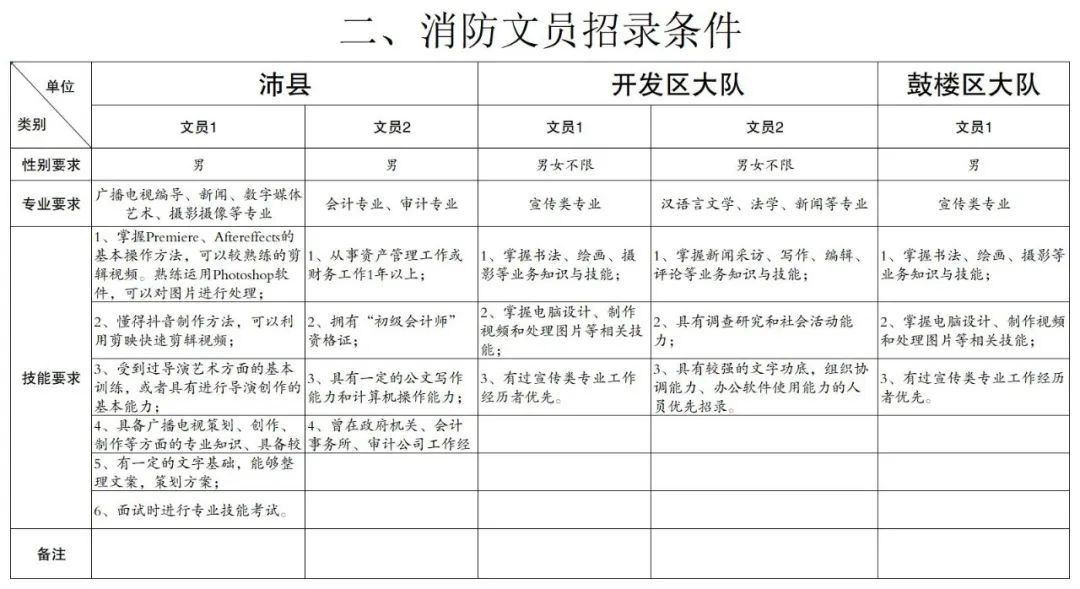 (七)政府专职消防队员为田径类体育特长生、退出国家综合性消防救援队伍的指战员以及消防救援工作急需的特殊专业人才,具有消防相关工作经验或者持有国家相关等级资质证书可适当放宽招录条件。消防文员具体招录条件详见附件一。
