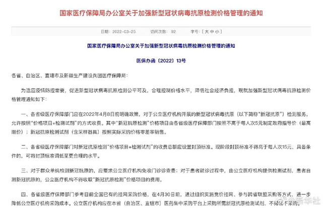 其中“新冠抗原检测”价格项目由各省级医疗保障部门按照不高于每人次5元制定政府指导价(最高限价);新冠抗原检测试剂(含采样器具)按照实际采购价格零差率销售。